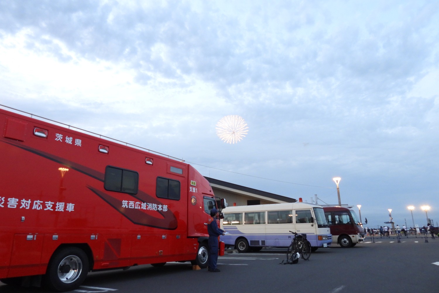 令和7年10月18日(土)ちくせい花火大会2025が開催されました。 筑西消防署では開催前から打ち上げ後まで、花火大会が安全に実施されるよう、打ち上げ場所である国道50号下館バイパス新常盤橋北小貝川河川敷近辺、及び小林地内の警戒を実施しました。